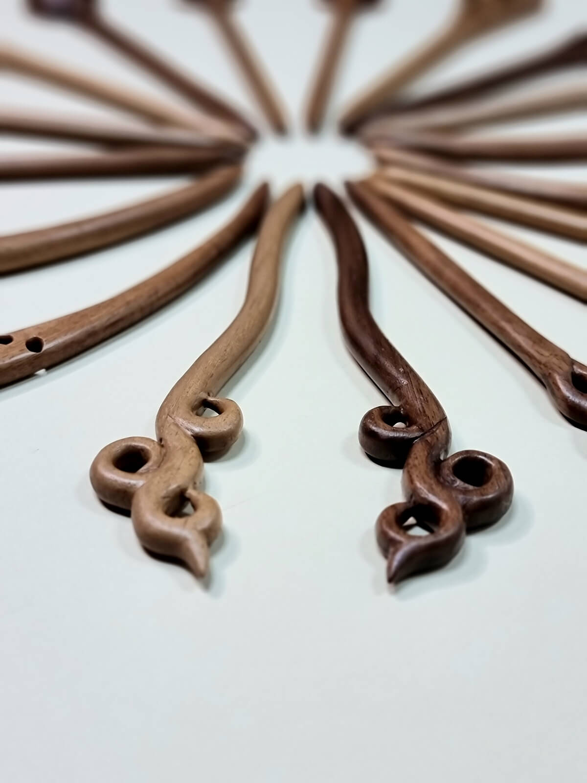 Резбаните шноли во облик на стапчиња за обликување на косата се практични и убави додатоци кои се користат со векови. Тие се направени од резбано дрво ( во нашата понуда од ореово дрво) и доаѓаат во различни дизајни и должини.