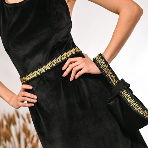 Чантата е изработена од црно кадифе со текстура која потсетува на мекоста на ноќта. Златните житни детали се фокусната точка, создавајќи магичен и драматичен ефект.