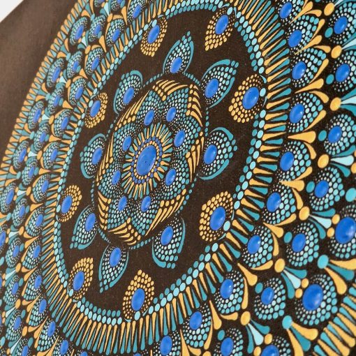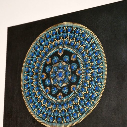 Мандала, во превод значи мистичен круг. Претставува мал универзум создаден со разни форми во круг, кои симболизираат дека се е поврзано. Животот не завршува, туку повторно се раѓа. Димензии: 50х40 цм.